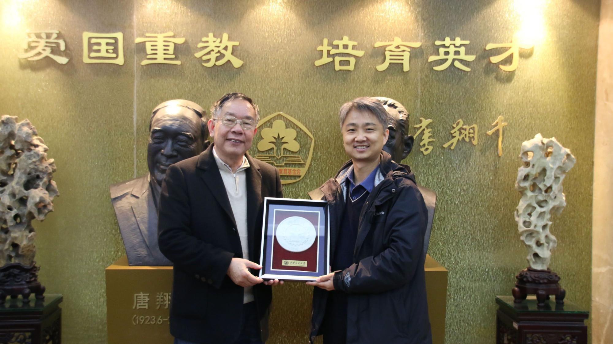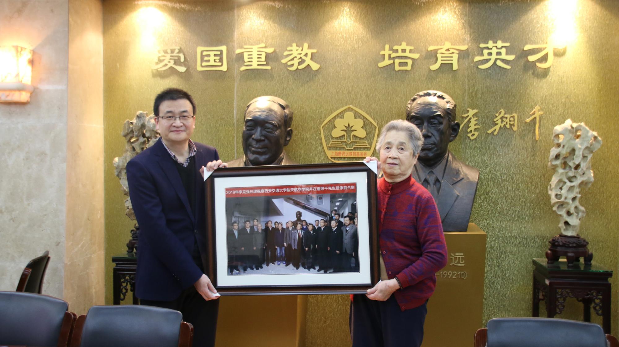 时在学院大厅唐照千教授塑像前的合影。李小跃书记向唐君远教育基金会赠送了西安交大纪念玉盘。唐君远教育基金会金同康秘书长回赠学院《唐君远与唐氏家族传奇》一书作为纪念。