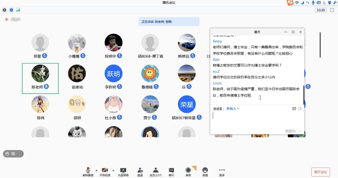 随后,会议进入自由提问环节。2021届毕业生围绕学位申请、毕业等提出了更多细节问题,各位老师均逐一解答,为毕业生提供了切实参考和帮助。