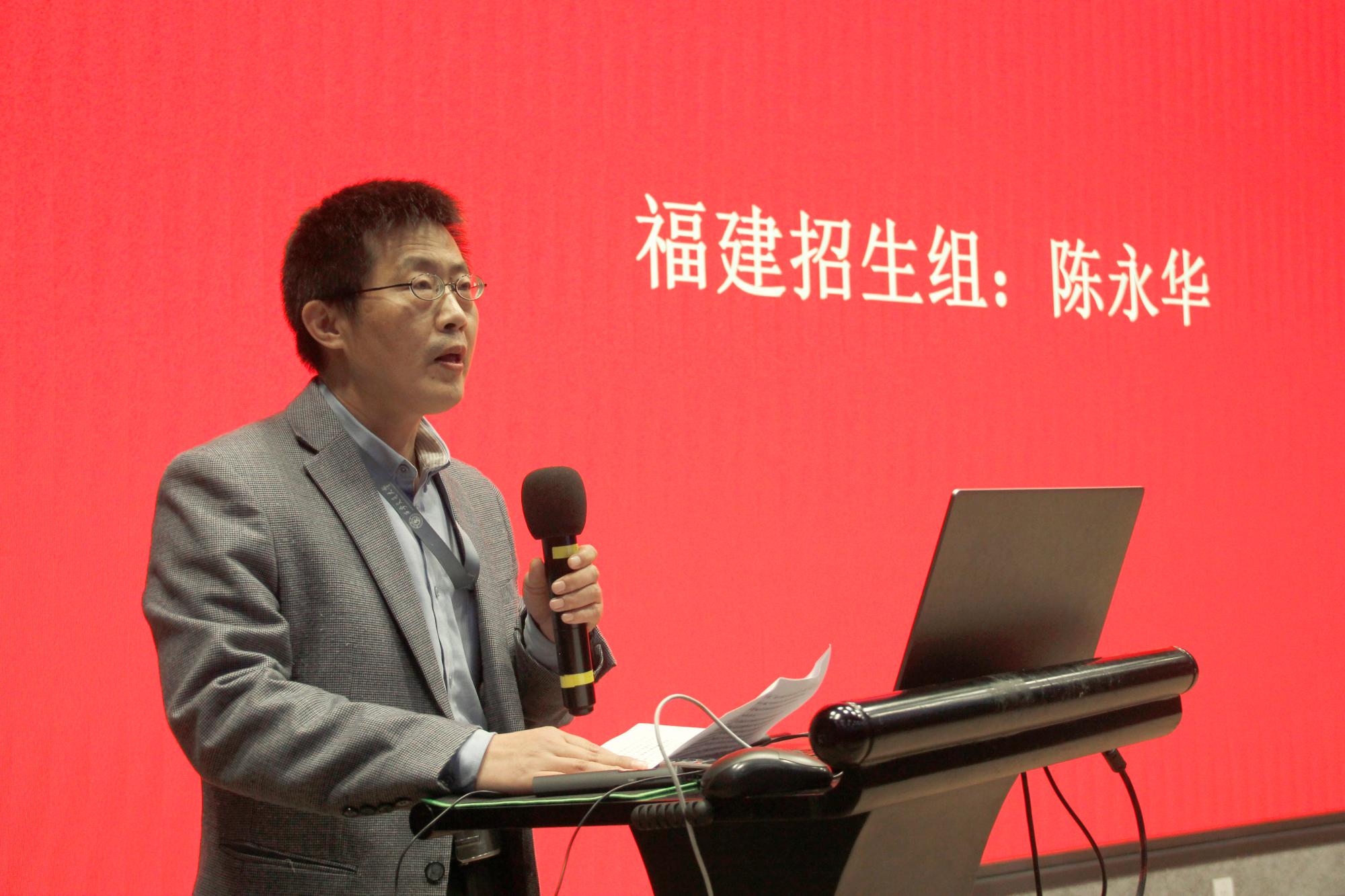 福建招生组组长、航天学院党委副书记陈永华代表先进招生组发言。他表示福建招生组主要有三点经验和做法:一是用真心建设好与重点生源中学的合作关系,二是用热心积极开展线上线下招生宣传,三是用感情做好招生宣传咨询的“两大步”和“一纽带”。