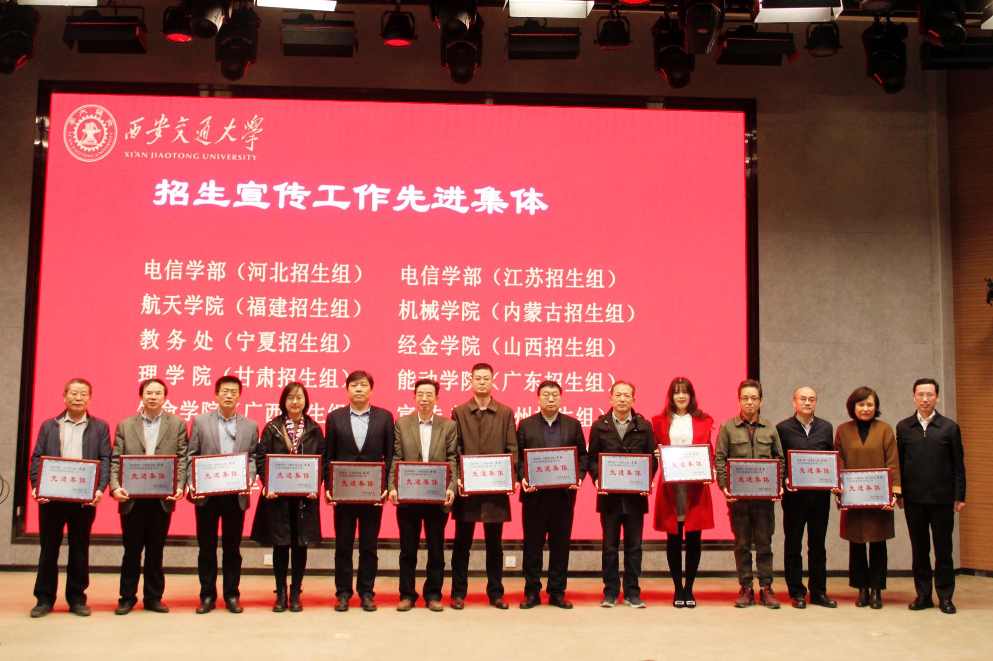 招生办副主任宋红霞宣读《关于表彰2020年招生工作先进集体、先进个人的决定》,郑庆华,学校招生委员委员、钱学森学院常务副院长杨森,王秋旺分别为招生宣传工作先进集体、进步集体、单招先进集体、优秀校友集体、优秀招生专员、先进个人、优秀学生志愿者颁发了奖牌或奖状。因工作关系,优秀校友们未能到场,奖状将在会后通过其他方式送达。