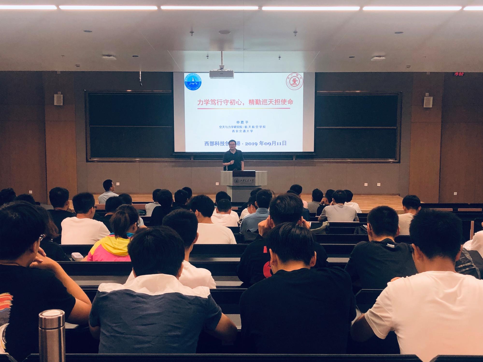 开办了为期三个月的新港力行系列报告,每周三邀请著名教授、学者开讲。首场新港力行系列报告于9月11日晚在创新港涵英楼东101如期举行,申胜平院长以“力学笃行守初心,精勤巡天担使命”为题开启了新港报告的序幕。2019级全体研究生新生悉数到会。