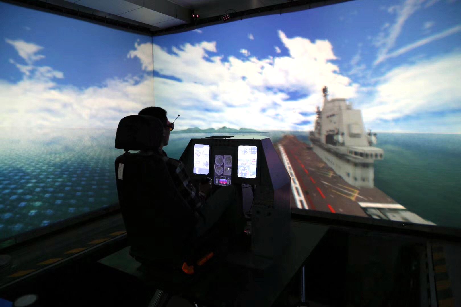 航空模拟器驾驶舱利用机械结构强度与振动国家重点实验室的飞行器虚拟设计与仿真系统,通过六自由度运动平台和服务器驾驶中心以及多台分布式电脑构成的仿真系统,在梁勇奇副教授的解释和指导下,进行基于海空背景下飞行仿真驾驶体验,学生感受起飞降落的实际操作模拟体验。博1843班林天龙体验过后表示,“在虚拟机上驾驶着舰载战斗机,体验了战斗机在航母上起飞、翱翔,身临其境,这个时候我觉得自己就是一名空军飞行员,开着战斗机在天空中做一些姿态的变化,尝试了荷兰滚,第一次操作还不怎么熟练,不过5D体验是真刺激!”