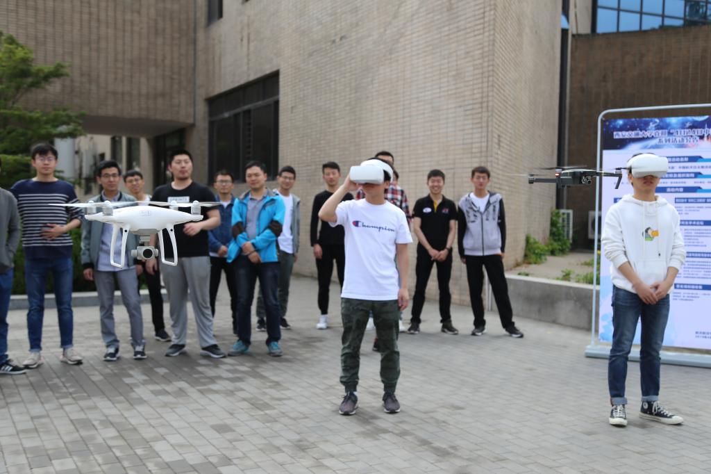 无人机第一视角飞行VR体验,通过在无人机加装无线图像传输设备,参与人员可以在地面通过视频眼镜或显示屏看到无人机飞行时的前方画面,据此操控无人机前进。前往体验第一视角飞行的师生络绎不绝。硕8066刘林感慨道,“虽然无人机和虚拟现实已经是两套非常成熟的技术,但是把这两套技术结合在一起的时候简直可以称之为完美。通过操纵手柄和转动视角,校园的风景尽收眼底。”
