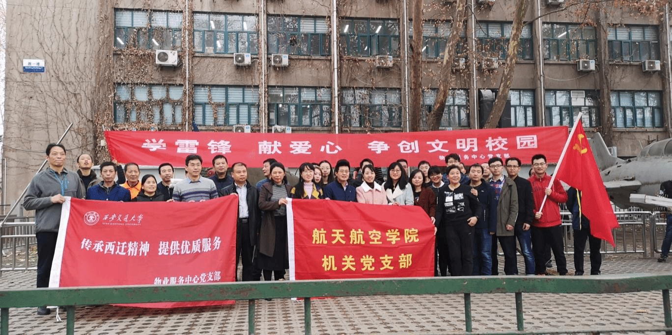 在两会召开和学雷锋日来临之际,3月5日下午,航天学院机关党支部、物业服务中心党支部、航天学院17级硕士生第一党支部联合开展了“雷锋日喜迎两会,停机坪再换新颜”支部联谊共建清扫活动。