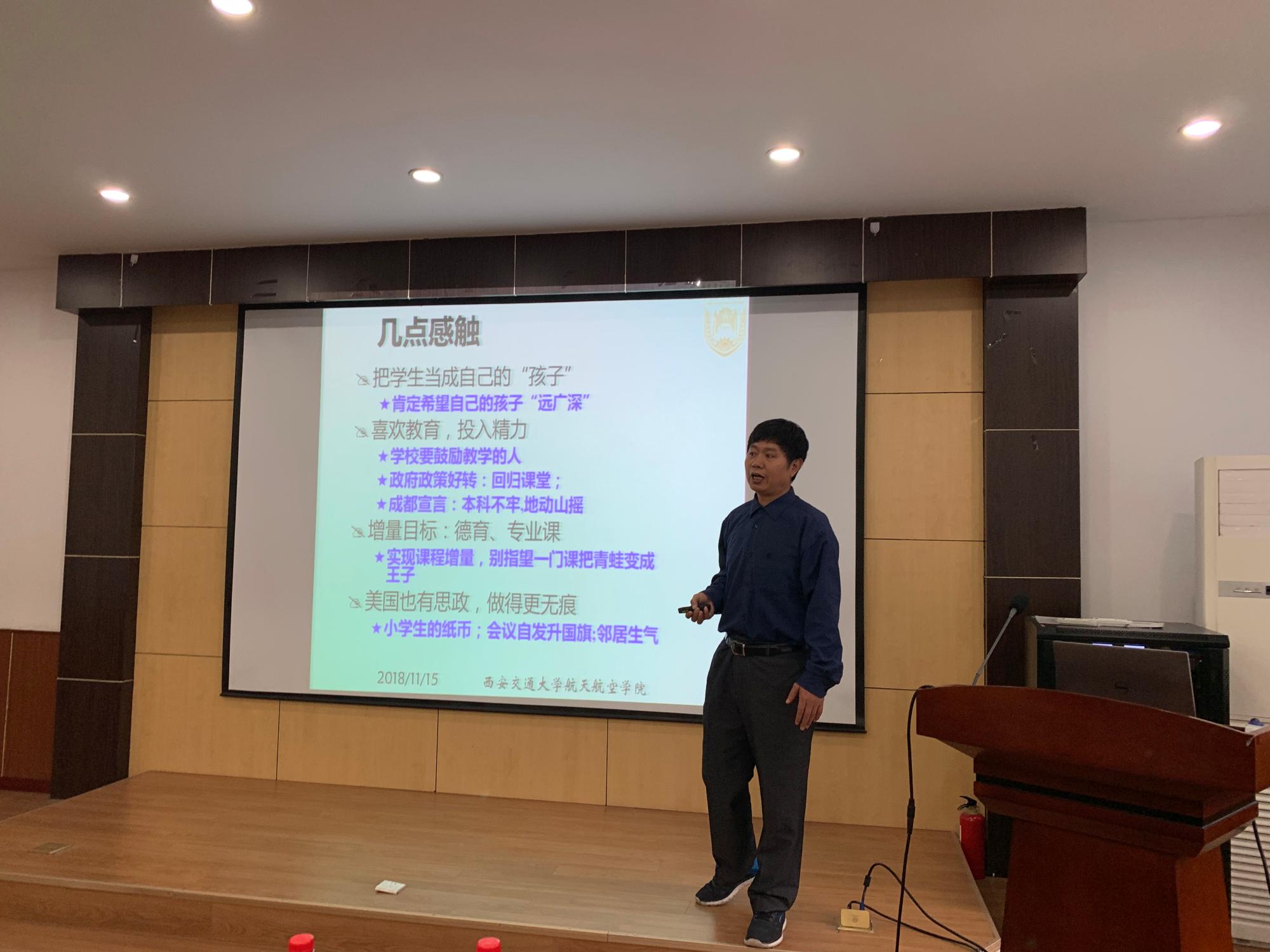 、校教务处及教师教学发展中心共同主办的“名师系列讲座”第六期在第五会议室举行。此次讲座邀请中国农业大学陈奎孚教授做“力学课程思政——让‘坚硬’的专业课‘柔软’起来”的主题报告。我院及西安理工大学、西安建筑科技大学、西安政法学院、西安工程学院等兄弟院校的多名老师聆听了此次报告。航天学院副院长吴莹教授主持本次讲座。