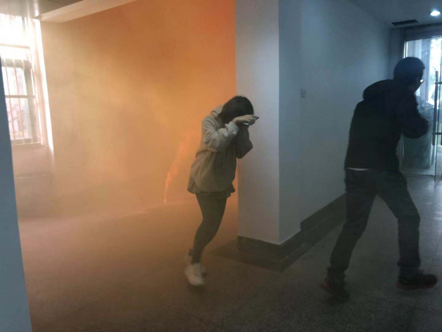 本次疏散演练利用发烟筒模拟火灾逼真效果,进行教一楼发生火灾后的逃生演习,在火警哨声的警报下,全体师生手持湿毛巾握住口鼻、弯腰、贴墙从工作室、实验室、办公室快速有序进行疏散。在组织人员认真细致地制定的演练活动方案组织下,完成了在楼下空旷地带快速集合的任务,消防疏散演练取得了预期效果。