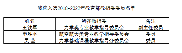 我院王铁军教授聘为力学类专业教学指导委员会副主任委员,申胜平教授聘为航空航天类专业教学指导委员会委员,吴莹教授聘为力学基础课程教学指导委员会委员。在新一届教指委中,西安交大共有57人入选,其中主任委员4人,副主任委员10人,有2人兼任2个教指委职务,委员覆盖理、工、医、经、管、文、法、教等多个学科门类,入选总人数较上届多12人,位居全国前列。