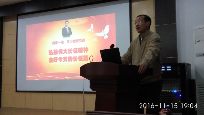 党课上,江俊教授以“弘扬伟大长征精神,走好今天的长征路”为主线,回顾长征历史,讲述长征精神。他首先具体讲解了“两学一做”学习教育活动的内涵、学习教育的具体内容、以及学习教育的主要措施。江老师强调,教育对象要面向全体党员,要由之前只针对关键少数、集中性教育转变为面向广大党员的经常性教育。每个党员都要努力争做合格党员,要做到四讲四有:讲政治、讲规矩、讲道德、讲奉献;有信念、有纪律、有品行、有作为。