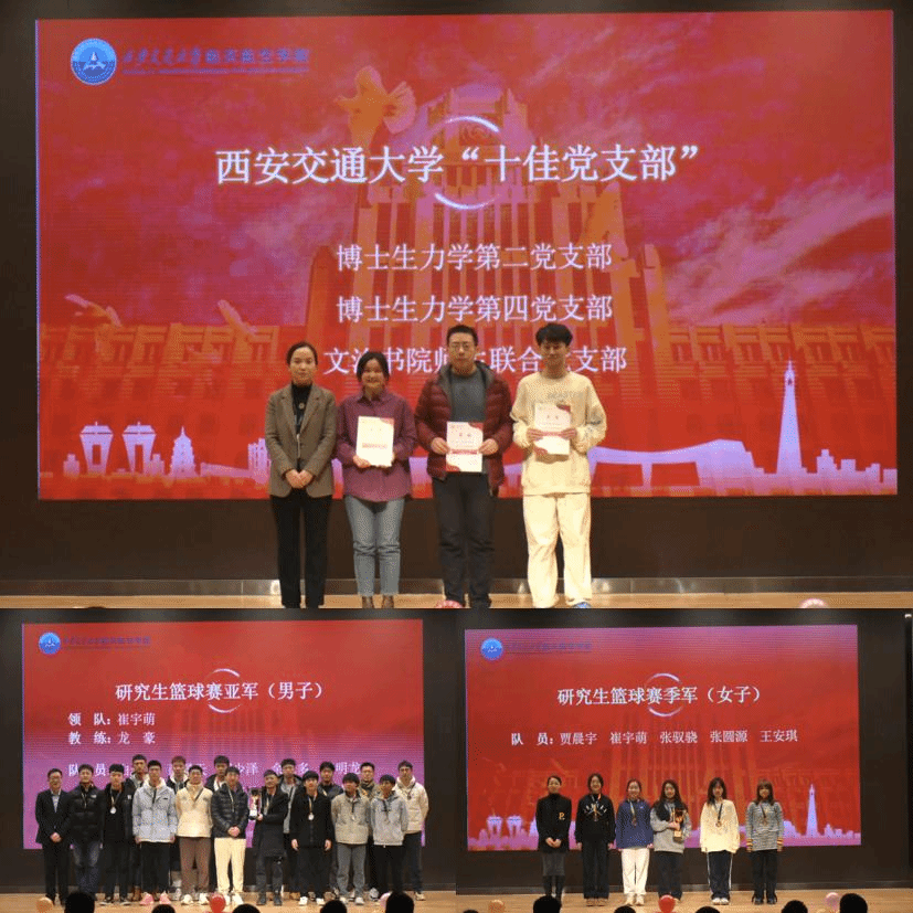 李昱静、陆天舒和韩阳分别为2023年校“十佳党支部”、研究生篮球队(男篮)和研究生篮球队(女篮)团体颁奖。