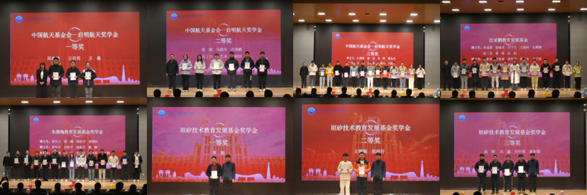 夏巍、解社娟、张杰、王正锦和张虎分别为中国航天基金会-启明航天奖学金、沈亚鹏教育发展基金奖学金、朱继梅教育发展基金奖学金和垣矽技术教育发展基金奖学金颁奖。