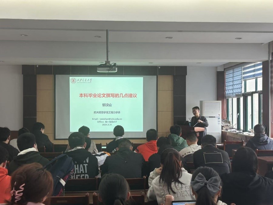他还常常深入学生,参加班会和书院座谈会,和青年学子面对面交流,亲切地为同学们答疑解惑。他多次向大一新生介绍专业方向和课程设置,向同学们展示学校工程力学专业拥有的坚实科研基础与雄厚科研实力,阐述力学在国家重大工程中发挥的突出作用,使大一新生对培养方案、课程设置、就业前景等方面有了更全面的了解,有效加强了新生的专业认同感。为进一步规范学院本科生毕业论文撰写,郁汶山教授结合往届学生论文评阅情况,以往届本科毕业论文为实例,逐条分析了同学们毕设论文中的常见问题和改进意见。