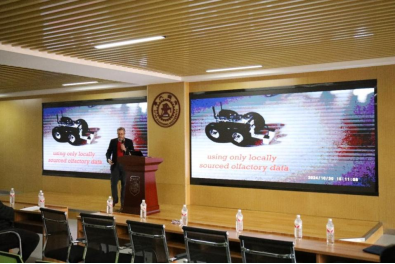德累斯顿工业大学材料科学与纳米技术讲席教授、欧洲科学院院士Gianaurelio Cuniberti,作了题为《机器学习在分子传感中的应用》的学术报告。报告会伊始,邀请人岳圣瀛教授介绍了报告人简历并对其到来表示欢迎。报告会上,Gianaurelio Cuniberti教授通过功能化纳米材料构建多通道气体传感器,模拟生物嗅觉系统对复杂环境分子的感知能力,介绍了当纳米传感器遇见机器学习掀起的仿生嗅觉革命,从实验室到规模化应用为表征的微型“电子鼻”突破,以及通过“医疗诊断、环境监测、公共安全”三大场景进入产业化论证阶段,并现场演示了该设备在1秒内区分甲烷泄漏与乙醇蒸气的案例,引发师生热烈讨论。