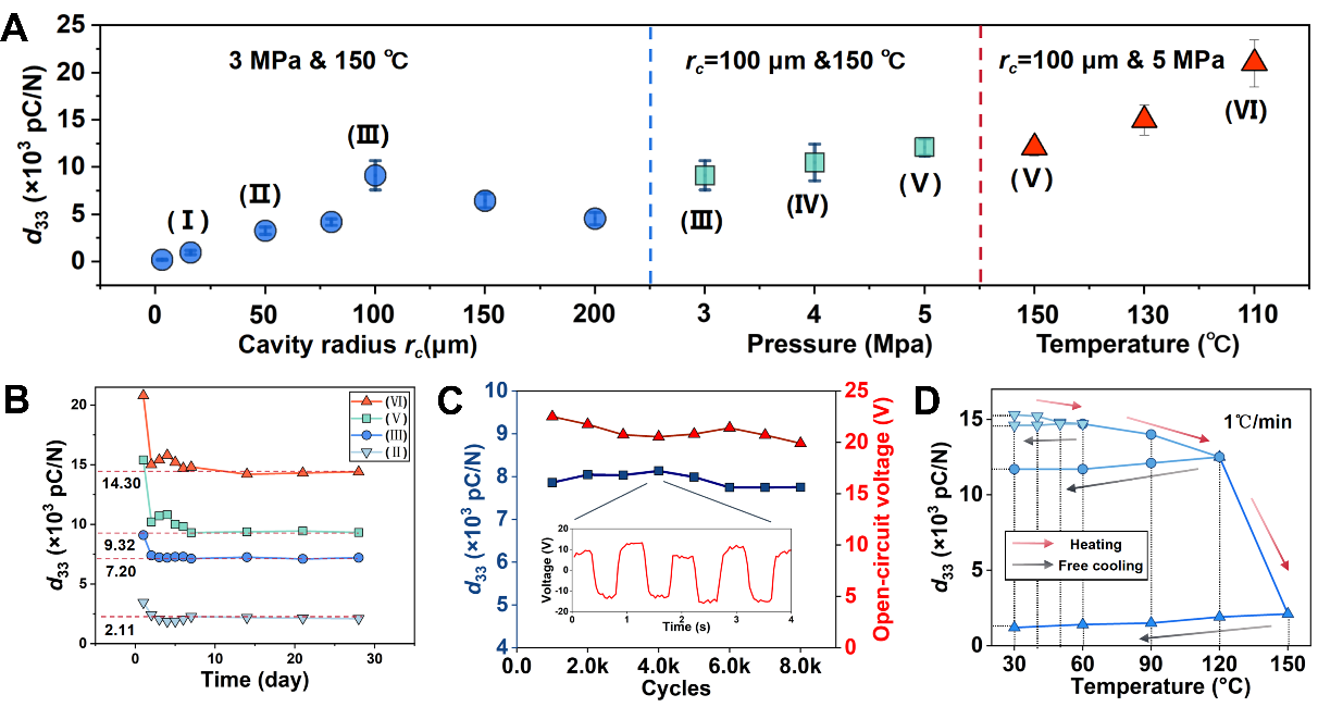 经过对孔隙尺度、预应力、以及温度变化等设计,使该驻极体的等效压电系数达到了1.5 × 10⁴ pC/N,是商业聚二偏氟乙烯(PVDF)材料的700倍以上,如图2A所示。驻极体材料内存储的电荷随时间、力学和温度加载而发生的衰减不容忽视。经研究,该驻极体材料的等效压电系数在极化后7天左右完成衰减并趋于稳定,其剩余等效压电系数为初始极化值的70 %左右,如图2B所示。该驻极体等效压电效应的力学稳定性如图2C所示,加载8× 103次后其等效压电系数仍未发生明显变化。温度方面,通过对该驻极体施加1℃/min的温度循环试验并检测其等效压电系数,得到如图2D所示的结果,表明了一定的高温适应性。