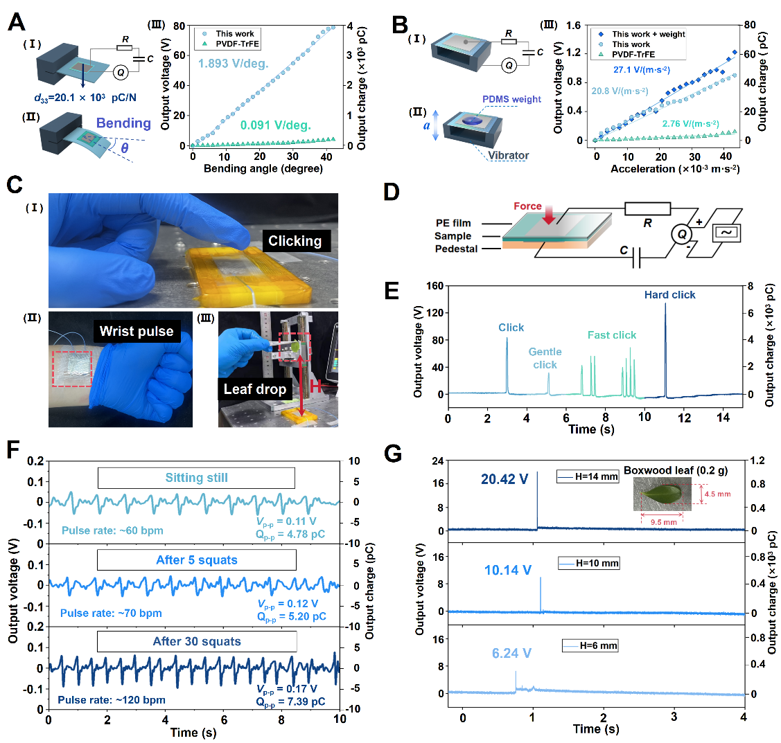 由于具有超强的等效压电效应和优秀的力学性能,该驻极体材料能够在大变形测量、高灵敏度力学量检测、生物力学量检测等领域发挥重要价值。如图3A所示,将该驻极体薄膜粘贴至柔性板表面并使其弯曲变形至40°左右,可看到在相同的几何尺寸下,本研究对弯曲角度测量的灵敏度达到了1.893V/°,是商业压电材料0.091V/°的20.8倍;在加速度测量方面,如图3B所示,其灵敏度也达到了同尺寸商业材料的10倍多。此外,本研究还能够对不同程度的敲击、人体不同运动状态下的脉搏、甚至树叶掉落的载荷进行精确测量,如图3C-G所示。上述工作通过跨尺度设计褶皱实现了具有超高等效压电效应的柔性驻极体,其高灵敏度的力学载荷传感能力,为生物医疗、微振动测量和抑制等领域提供了新的解决方案。