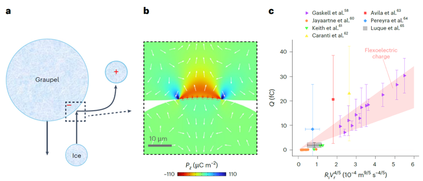 图5.冰-霰碰撞充电中的挠曲电贡献。a,典型碰撞过程及电荷分离示意图;b,接触界面附近的挠曲电极化;c,挠曲电极化电荷量(粉色带区)与风洞实验实测电荷量吻合