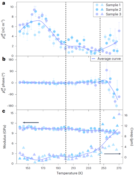 图2.挠曲电响应与力学特性的温度依赖性。a,挠曲电系数;b,位移与电荷相位关系;c,杨氏模量(左)和蠕变位移(右)