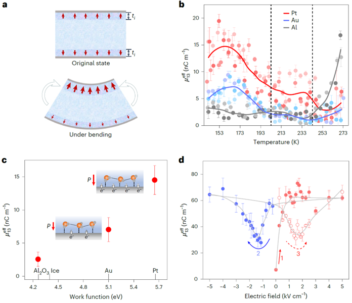 在此背景下,研究团队将目光转向样品表面。如泡利所言:“God made the bulk; the surface was invented by the devil.”这一洞见在挠曲电研究中同样适用。梁在弯曲时,表面处的应变最大;若其存在自发极化,则可在弯曲作用下产生净极化(图3a)。在特定材料和与边界条件下,表面贡献甚至可能超过体相。团队系统对比了不同金属电极(Au、Pt、Al)下的挠曲电响应,发现160K附近的峰值强度与电极种类密切相关(图3b),且与电极功函数呈正相关(图3c),表明该峰值源于界面诱导的极化增强。为检验这一界面极化是否可翻转,研究者在Au电极样品中施加不同预极化电压并测量挠曲电响应,观察到典型的蝶形电滞回线(图3d),表明冰表面可能发生了从Ih到XI的铁电转变。需指出,图3d所示数据均在撤去电压后测到,因而并非漏电流伪像[参见Jim Scott.Ferroelectrics go bananas,J. Condens. Matter Phys., 2007]。