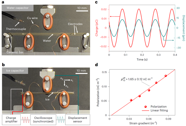 图1.样品制备及挠曲电表征。a,两片电极和水层组成电容结构;b,对冰电容梁进行三点弯加载;c,示波器同步记录位移和电荷;d,电极化与应变梯度呈线性关系