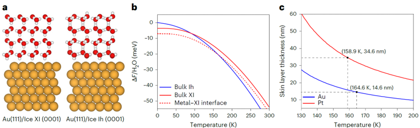 图4.金属-冰界面第一性原理计算。a,冰XI–Au(111)和冰Ih–Au(111)界面结构;b,电极界面作用降低冰XI相自由能,提升居里温度点(红蓝曲线交叉点);c,居里温度点与铁电皮肤层厚度关系