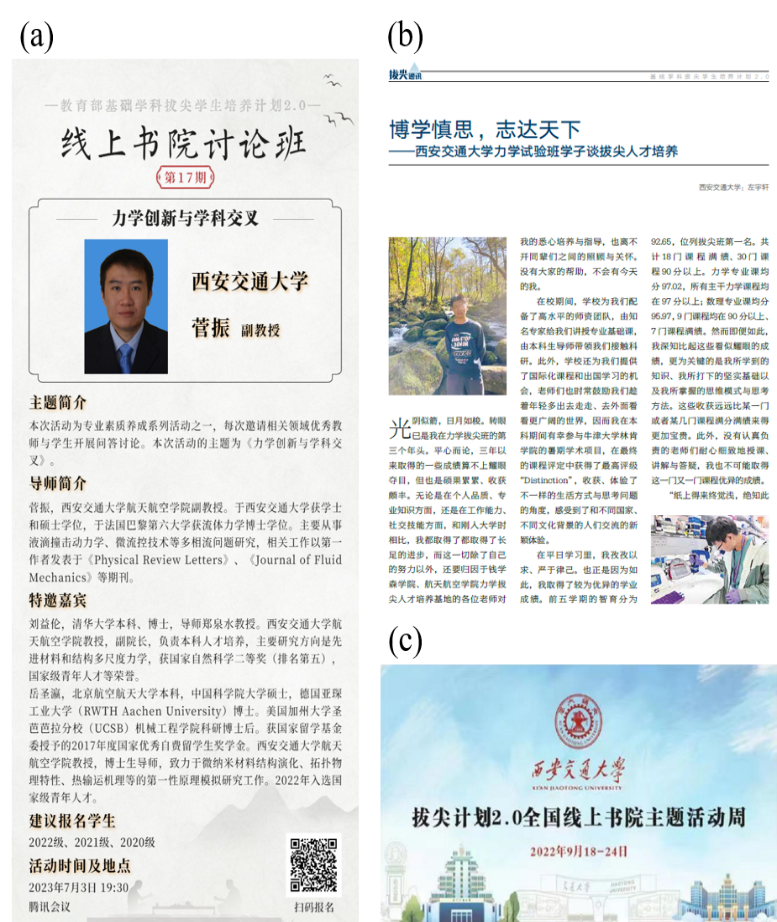 在菅振指导下,学生左宇轩在教育部内刊《拔尖通讯》发文,以亲身经历分享“力学拔尖人才的成长路径”,让更多学子看到“基础学科拔尖培养”的可能性。此外,他先后组织“全国拔尖计划线上书院讨论班”“拔尖计划2.0全国线上书院主题活动周”,邀请清华大学、北京航空航天大学等高校专家学者与学子共话“力学创新与学科交叉”,不仅把西安交大力学拔尖培养的“成功密码”——“党建引领+西迁精神+五个一流”模式分享出去,更搭建起全国高校拔尖人才培养的“交流桥梁”,推动基础学科拔尖人才培养“协同共进”。