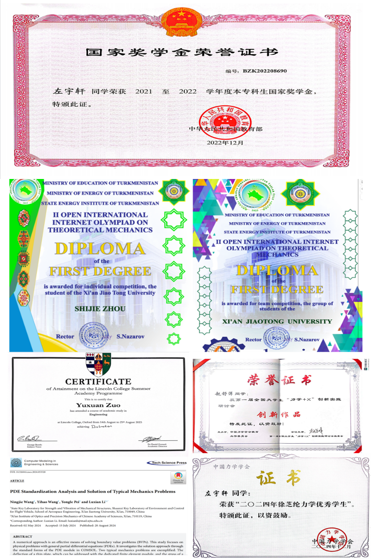 学科竞赛“捷报传”:学子们在国际、国家、省级竞赛中屡创佳绩,共获各类奖项80余人次——其中国际一等奖等国际奖项10余次,国家一等奖等国家级奖项20余次。在第二届土库曼斯坦国际理论力学互联网奥林匹克竞赛中,班级团队更是斩获团队一等奖,让中国学子的力学实力在国际舞台上闪光。