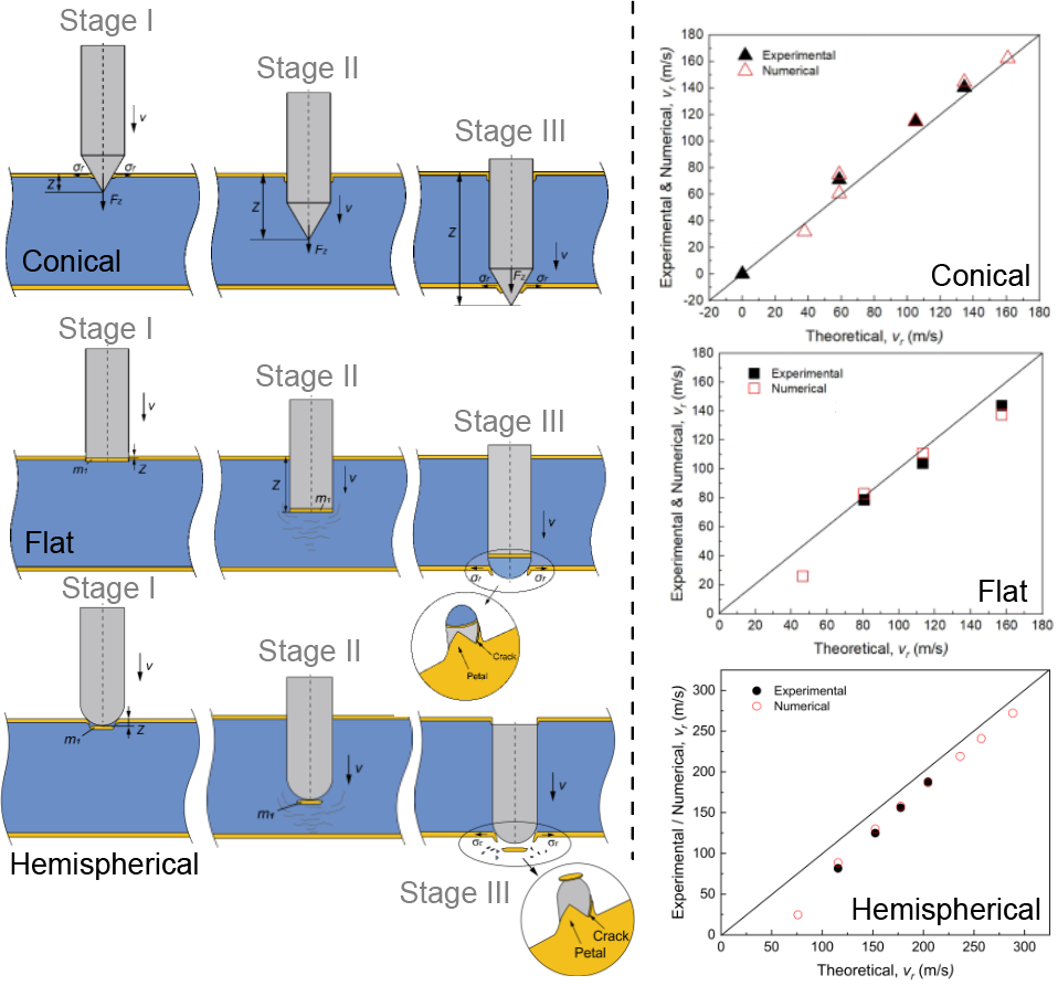近日,色情网 秦庆华教授和新加坡国立大学Poh L.H. 教授针对三明治金属泡沫夹芯复合防护的弹道极限问题,系统地开展了三明治夹芯复合防护结构的高速冲击破坏实验(图1),获得了平头、球头及锥头弹体的入射速度、剩余速度以及夹芯复合防护结构被贯穿后的破坏形貌等重要实验数据(图2);提出了泡沫芯材层细观结构重构的高精度新算法,建立了夹芯复合结构跨尺度弹道冲击数值模型(图3);以实验结果导引,提出了三明治夹芯复合防护结构刚性弹体侵彻动力学新理论模型(图4)。研究获得了高速弹体冲击下夹芯复合防护结构的多种新失效模式,揭示了高速弹体侵彻下三明治夹芯复合结构的能量耗散机制,阐明了三明治复合夹芯结构各组成部分的能量分配原理,提出了以复合防护结构抗弹能力为驱动的夹芯复合防护结构质量分布设计策略,回答了在相同面密度条件下如何设计芯材可压缩三明治复合防护结构的迎弹面板和背面板的问题。研究结果表明,较厚的迎弹面设计有利于提高复合防护结构的抗弹性能。