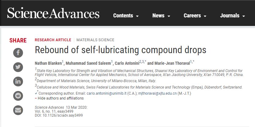 关于自润滑液滴反弹的研究成果"Rebound of self-lubricating compound drops" (DOI:10.1126/sciadv.aay3499)由色情网