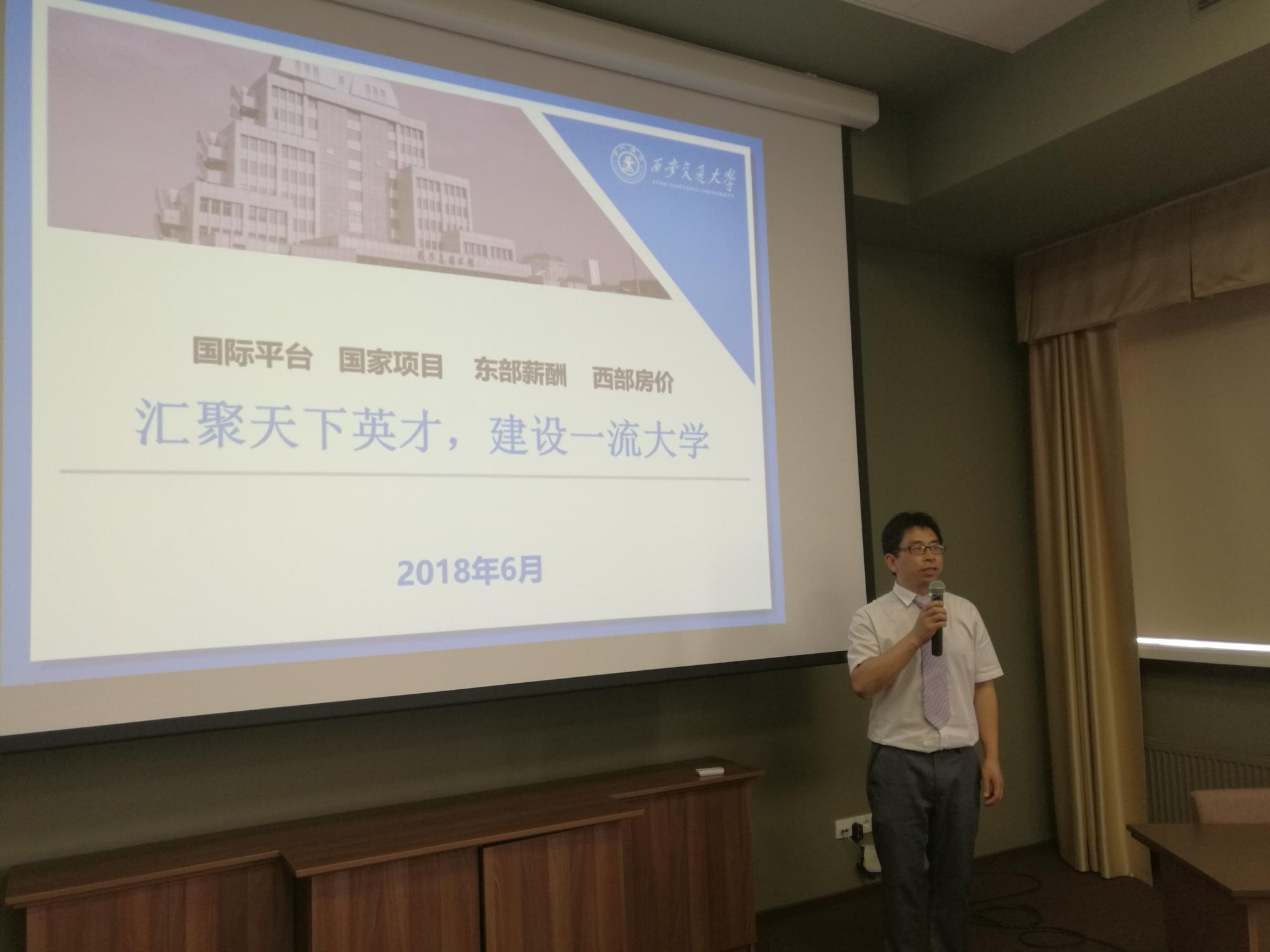 海外人才招聘的宣讲,刘振主任做了关于博硕士招生与培养的宣讲,对海外学子赴我校工作和学习的相关政策进行了详细解读。