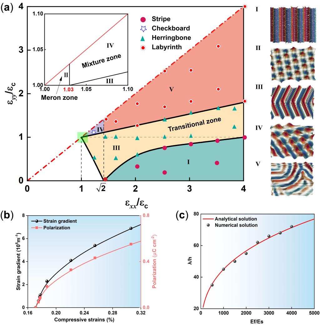 图4. (a)极化拓扑结构随双轴压缩应变变化相图;(b~c)极化幅值和周期性极化结构波长随所受压缩应变和薄膜-基底弹性模量比的变化