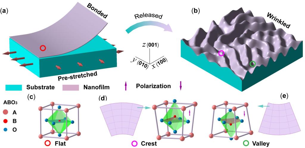 力化学耦合与智能介质实验室报道了一种基于褶皱诱导挠曲电效应的极化拓扑结构调控方法。这种基于挠曲电效应的调控策略不再受限于超晶格结构或铁电材料,可广泛适用于所有中心对称或非中心对称纳米薄膜,为极化拓扑结构提供更广阔的材料和结构选择空间。相关成果以“Mechanical Control of Polar Patterns in Wrinkled Thin Films via Flexoelectricity”为题发表在物理学旗舰期刊Physical Review Letters上。