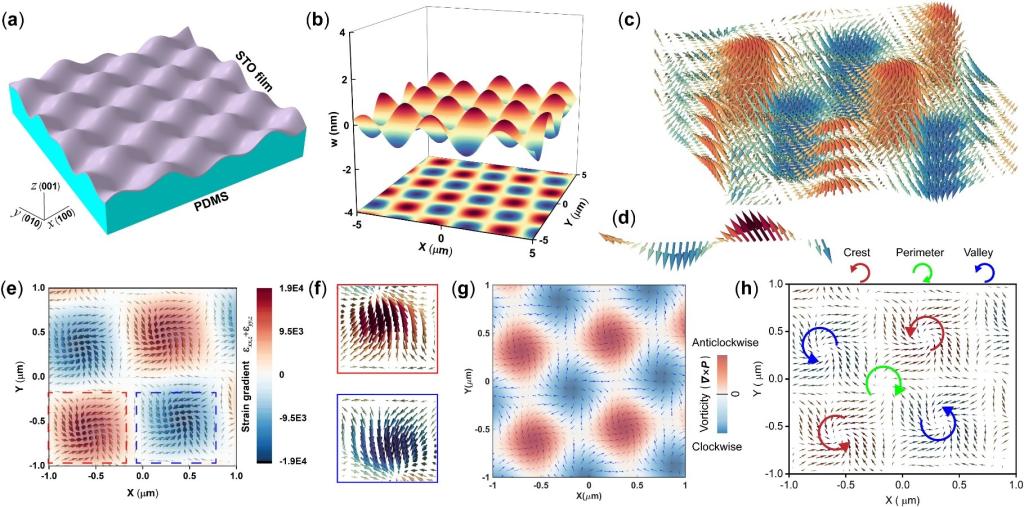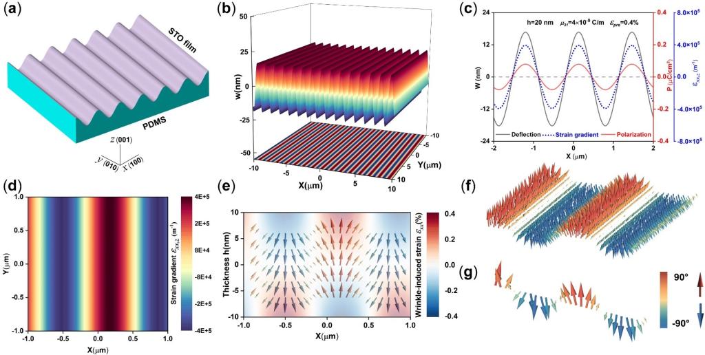 图2. (a-b)单轴压缩下条纹褶皱形貌诱导产生的(c~g)应变梯度场及对应的极化结构
