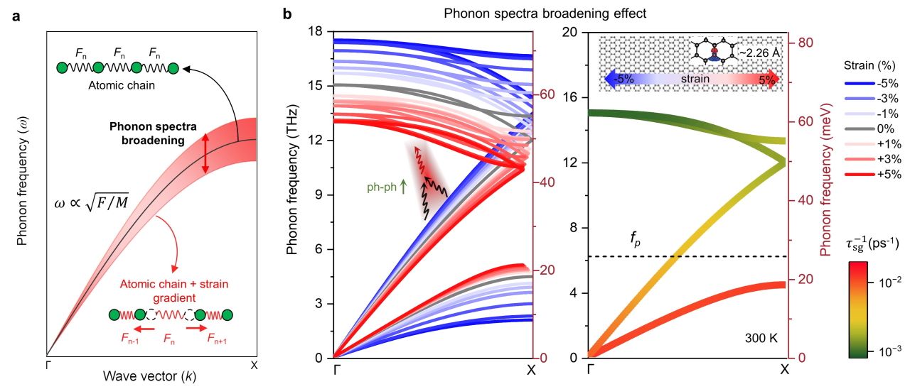 图3.声子谱扩展增强声子散射率。(a)受应变梯度调制的声子色散示意图。(b)左侧,硅在不同弹性应变下的声子色散。右侧,应变梯度为0.118% /nm下声子谱扩展引发的声子散射率,τsg−1。