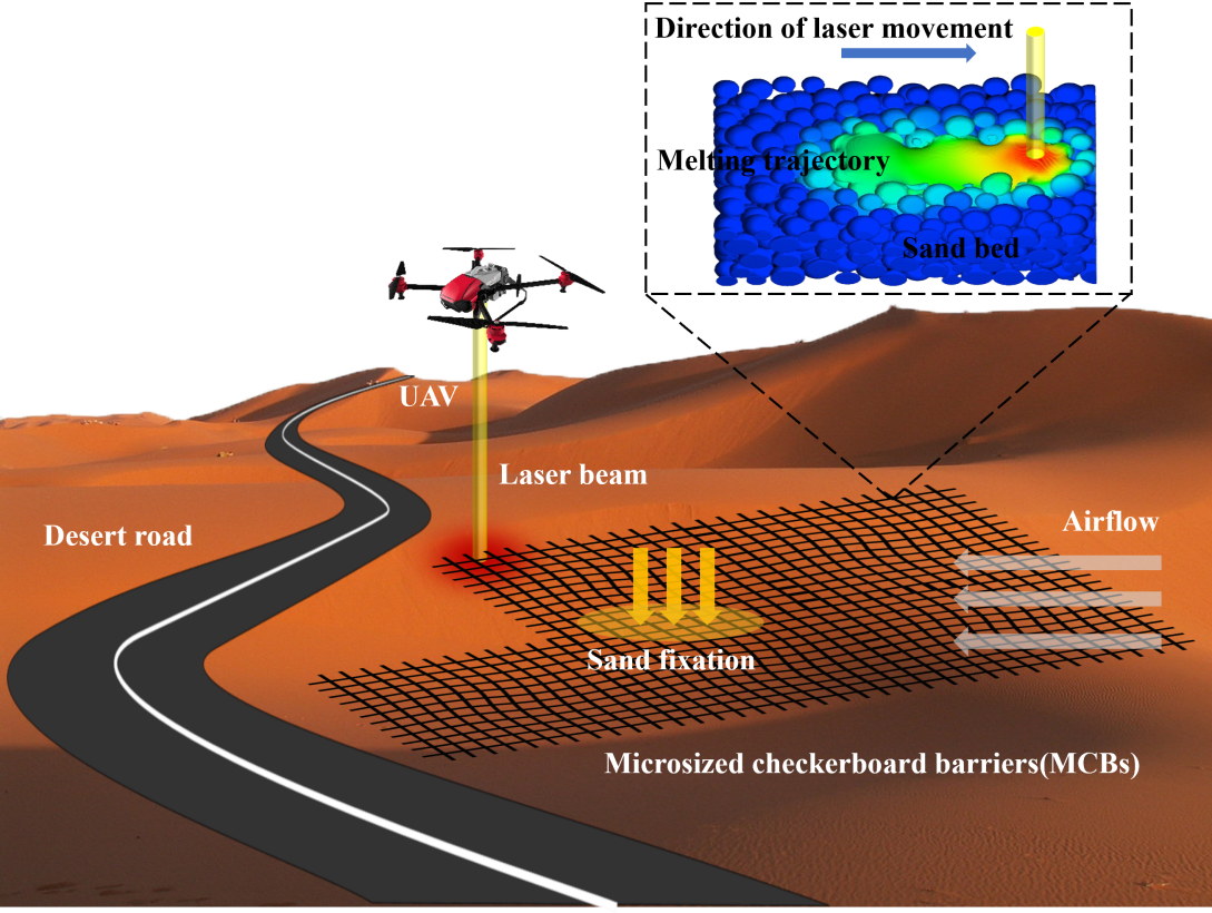 蔡小兵教授团队提出的无人机激光固沙技术,通过北斗导航精准定位,让无人机携带激光设备在沙漠表面烧蚀形成毫米级网格(MCBs),无需人工、仅耗电力即可实现全自动化固沙,相关成果发表于国际机械类顶级期刊《增材制造》(《Additive Manufacturing》),获得国际同行高度认可。
